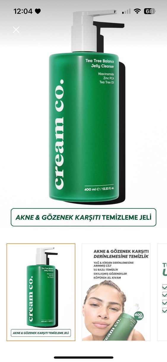 Creamco yüz temizleme jeli sadece iki defa kullanabilme şanşım oldu sivilce tedavisine başladığım için kullanmadım ama makyajı çok güzel temizliyor içeriğine güvendiğim bir ürün orjinaldir Cream Co. jel temizleyici, niasinamid, çinko PCA ve çay ağacı yağı ile yağlı ve karma cildi derinlemesine temizler, akne ve sıkışmış gözeneklere karşı etkilidir. Yumuşak jel kıvamıyla cildi nazikçe arındırır.