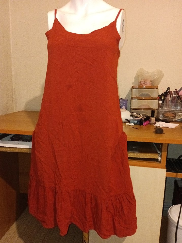 Astarlıdir.Keten kumaştan, askılı, salaş kesim midi boy kırmızı elbise. Etek kısmında fırfır detaylar bulunur, bohem tarzda günlük kullanım için uygundur.