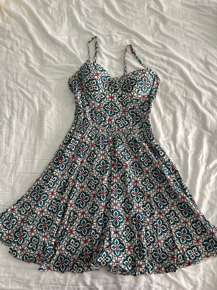 Çok renkli bağlama deseniyle, askılı ve straplez yakalı, pilili, vücuda oturan bohem midi elbise.