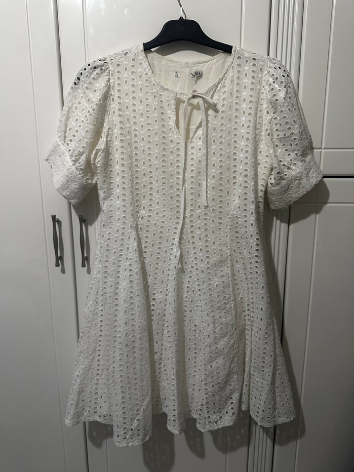 Bağcıklı yakalı, kısa balon kollu, fisto kumaştan yapılmış beyaz midi boy bol kesim elbise. Bohem tarzda, hafif ve ferah.
