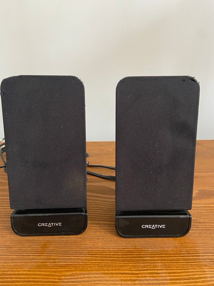 Creative siyah masaüstü müzik sistemi, kumaş kaplı kompakt hoparlörlere sahiptir, kişisel ses kullanımına uygundur.