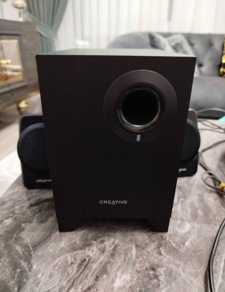 Creative marka siyah müzik sistemi, ön tarafında bas portu bulunan kompakt tasarıma sahiptir ve net ses sunar.