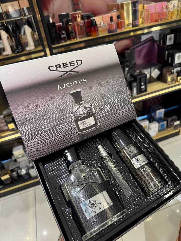 CREED Aventus erkek parfüm seti, gri şişesi ve avangart tasarımıyla dikkat çeker. Ana parfüm, seyahat spreyi ve deodorant sprey içerir.