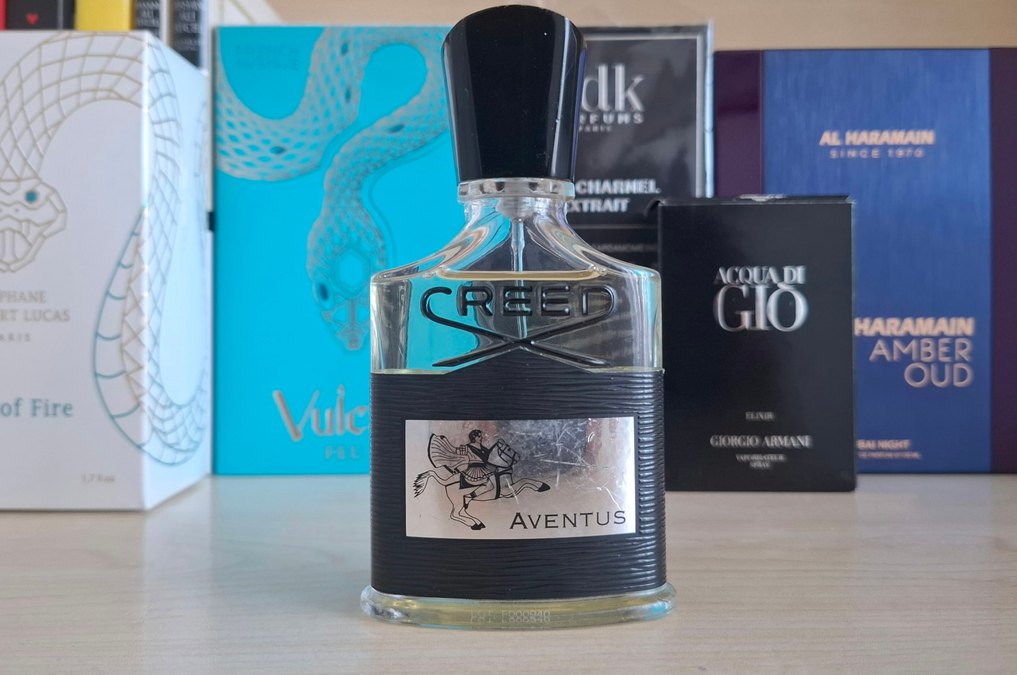 Modern avant-garde tarzda parlak siyah şişede Creed Aventus erkek parfümü. Etiketinde cesur karakteri yansıtan atlı figür yer alıyor.