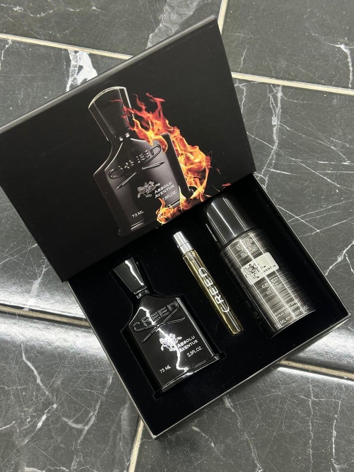Creed erkek parfüm seti, koyu siyah şişede gotik tarzı yansıtıyor. Tam boy parfüm, seyahat boyu sprey ve deodorant içerir.