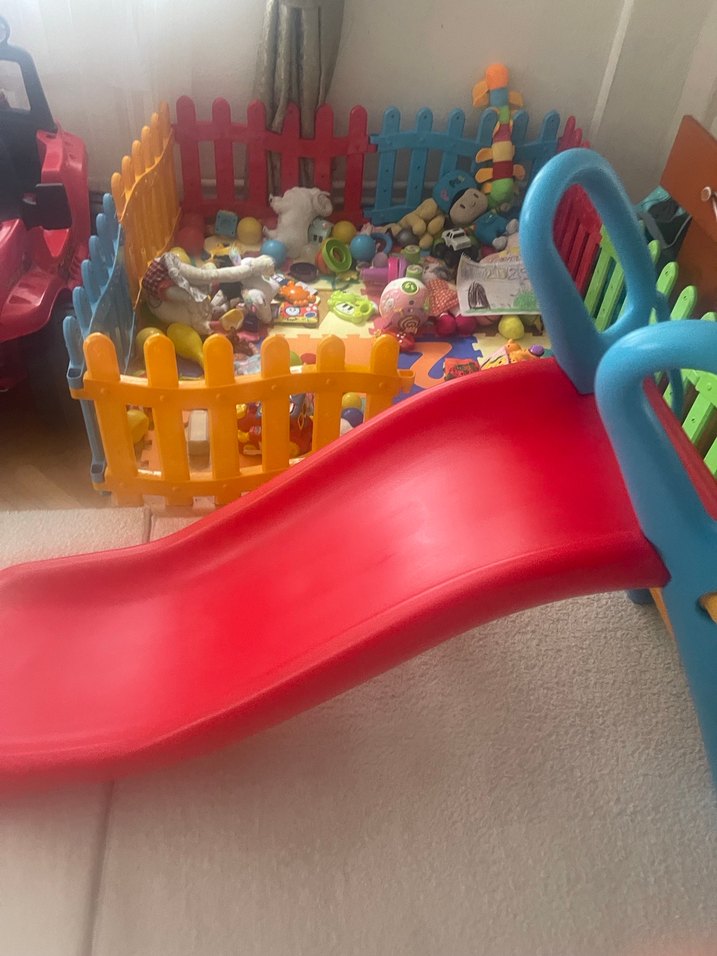 Canlı kırmızı kaydırak çok renkli çit ve oyun halısı dört çöp poşeti dolusu renkli topları da var pilsan marka