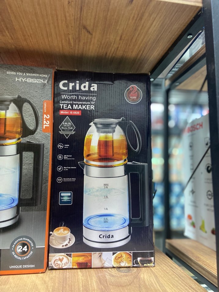 Crida markasının 2.2 litrelik beyaz ve gri renkli çay makinesi, cam demliği ve kolay kullanım özellikleriyle dikkat çekiyor. Model HY-892L.