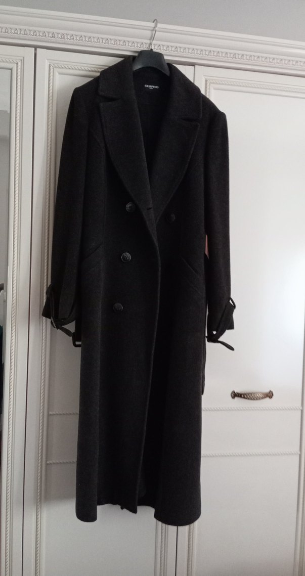 Crıspıno Antrasit Rengi uzun kaban, çift düğmeli ve kuşaklıdır. Yaka ve yan cepleri vardır, kol manşetlerinde kuşak detayı bulunur.