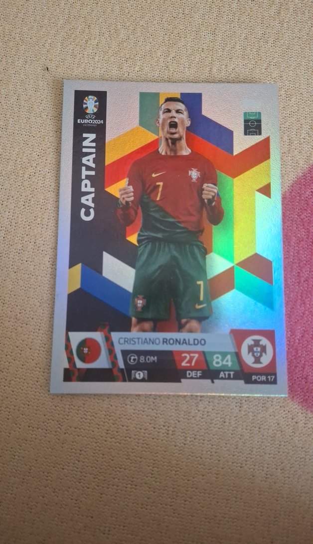 Cristiano Ronaldo'nun kaptan rolünde olduğu, renkli geometrik arka planlı ve oyuncu istatistikli canlı pop kültür rozeti. ⚽
