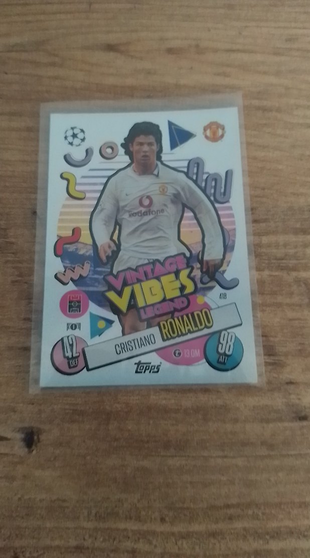 Beyaz renkte, pastel tonlarda retro pop kültür tarzında Cristiano Ronaldo figürlü rozet. Vintage havası ve Topps logosu içerir. ⚽