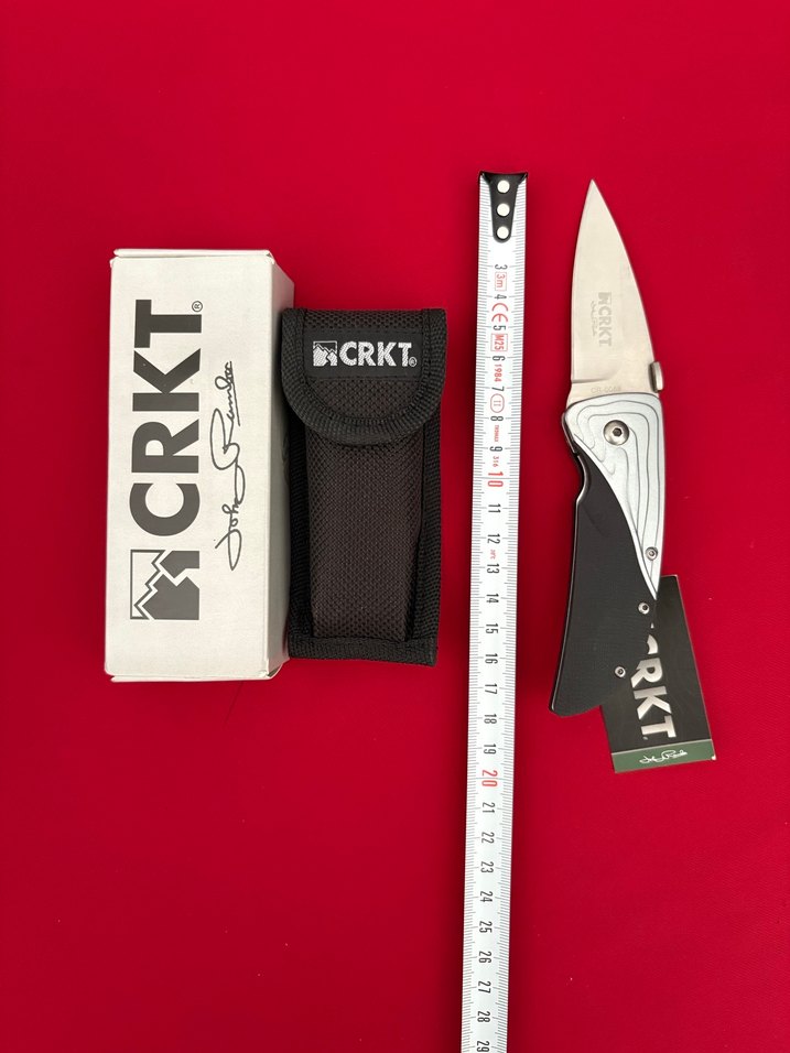 Paslanmaz çelik bıçaklı kırmızı CRKT katlanır bıçak, siyah taşıma kılıfı ve orijinal kutusuyla birlikte gelir. Bıçakta CRKT logosu ve model numarası bulunur.