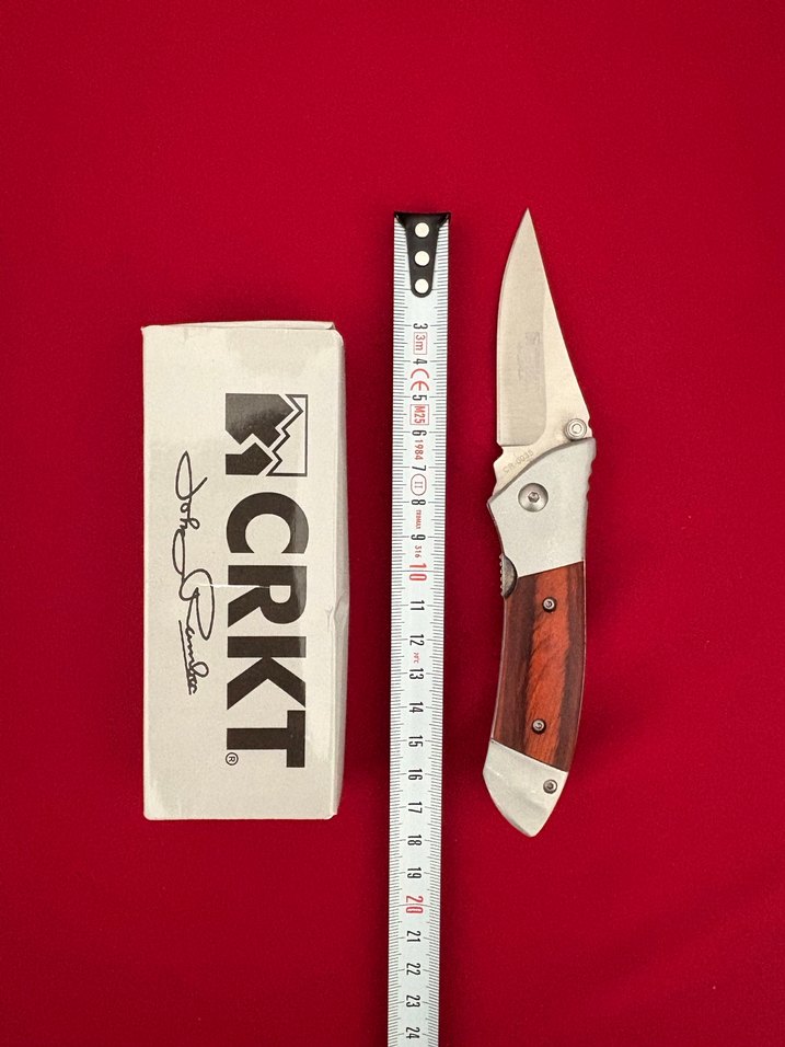 Ahşap saplı ve paslanmaz çelik bıçaklı kırmızı CRKT katlanır bıçak, kutusu ve metreyle birlikte gösterilmiştir.