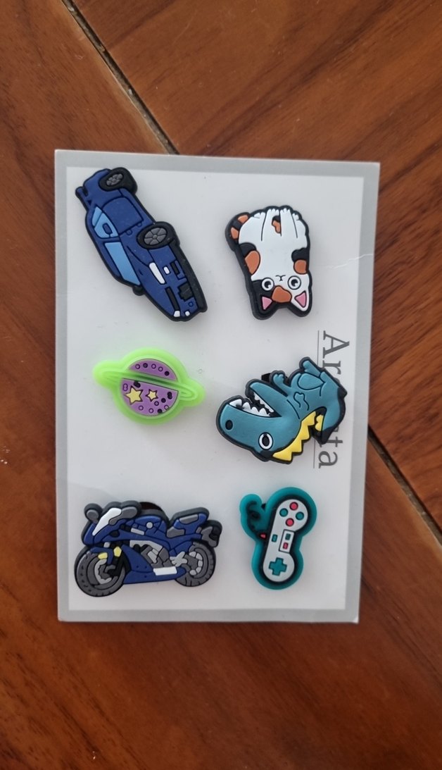 Crocs marka, erkek çocuklar için çoklu figürlü, plastikten yapılmış renkli baskılı aksesuar seti. Velcro ile kolay kullanım sağlar.
