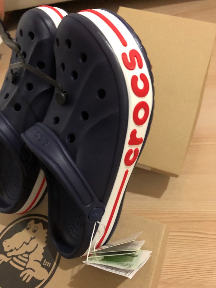 Crocs marka erkek spor sandalet, lacivert renkte kauçuk malzemeden ve baskılı desenli. Velcro bant ile rahat ve güvenli kullanım sağlar.