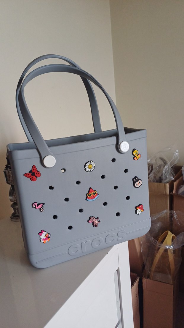 Gri renkte, tokalı ve baskılı figürlerle süslenmiş kadın plaj çantası. Günlük kullanım için dayanıklı plastikten üretilmiştir.