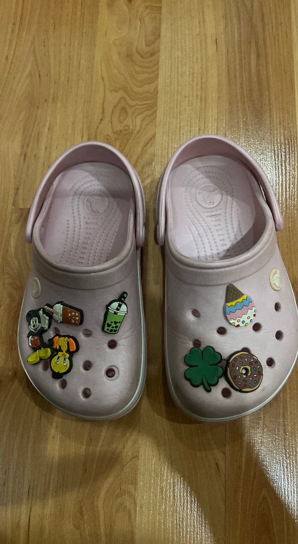 Düğmeli crocs bantlı, pembe kauçuk kız terliği. İşlemeli tarzda süslemelerle pastel tonlarda, rahat ve trend bir model.