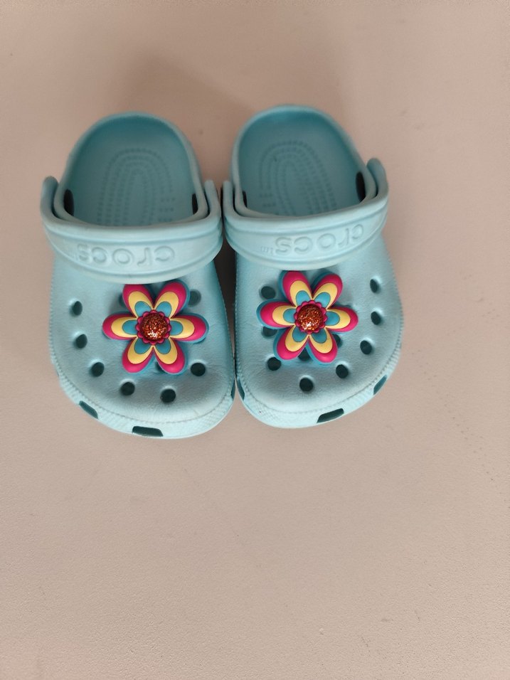 Çiçekli ve tokalı kayışa sahip mavi kız çocuk terliği, renkli ve pop kültür tarzında. 1,5 yaşına kadar kullanıldı,19-20 numaraya uygundur.