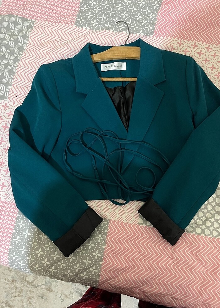 Bir kaç kez kullanıldı rengi ve duruşu çok şık renk olarak petrol mavisidir altta ipi mevcuttur bele dolanır ve çok şık durur