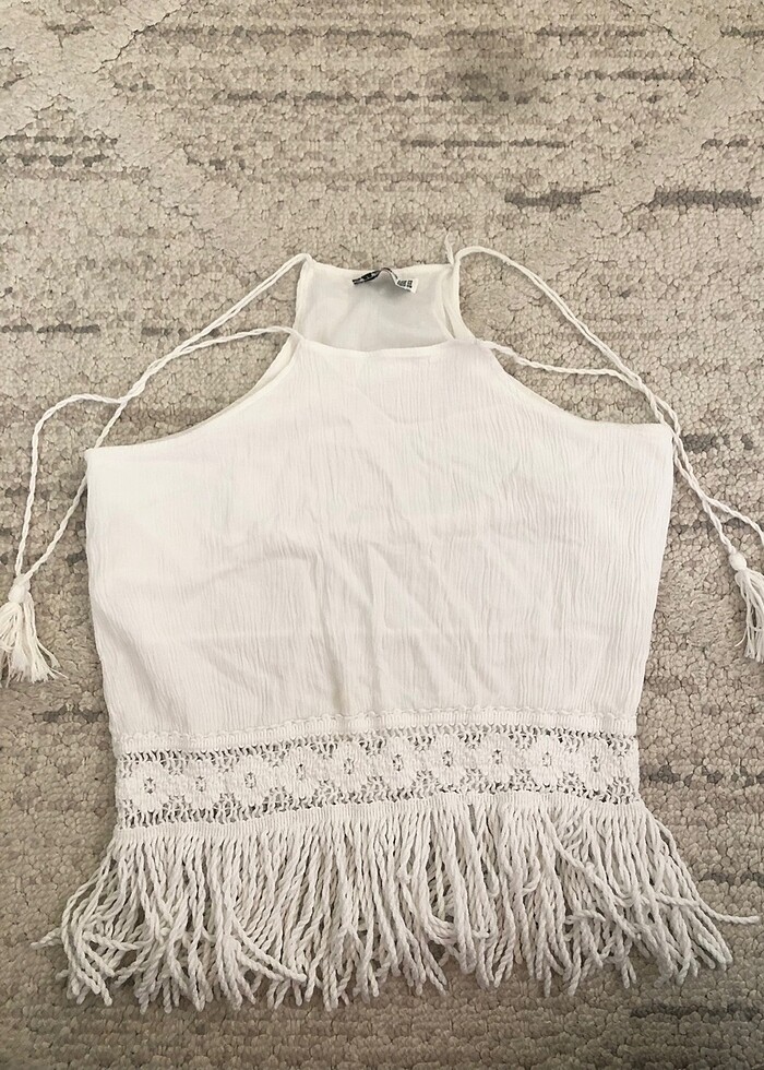 Astarlı püsküllü pamuk kumaş crop bluz askıları bağlanabilir şekilde.Astarında hafif sökükler var kullanıma engel değil dışardan görünmüyor astardaki içerde kalıyor fotoğrafta göründüğü gibi etiket m kalıp dar s Marka temsilidir