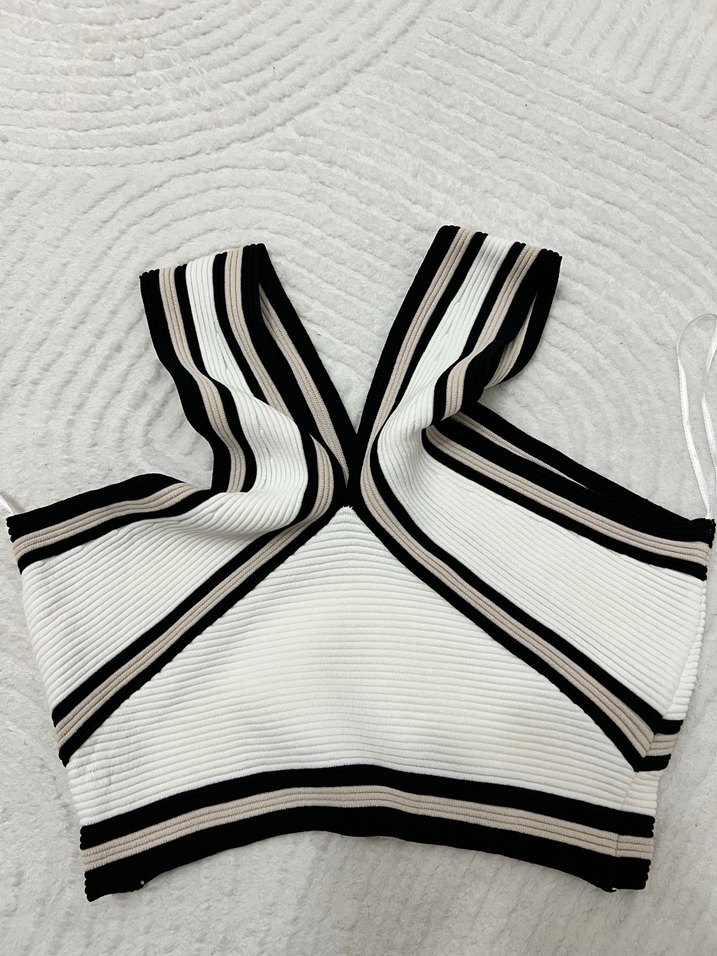 Beyaz ve gri tonlarda zebra desenli, pilili, dar kesim, tekne yaka ve askılı kadın crop. Yumuşak sentetik kumaştan, sokak modasına uygun. Standart beden sıfır ürün bir sorun yoktur network marka
