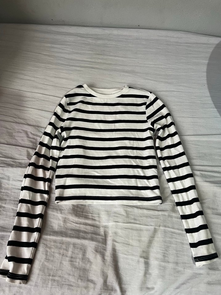 Pamuklu, uzun kollu ve tekne yaka kız çocuk bluz, beyaz ve gri çizgili deseniyle şık ve rahat bir görünüm sunar.