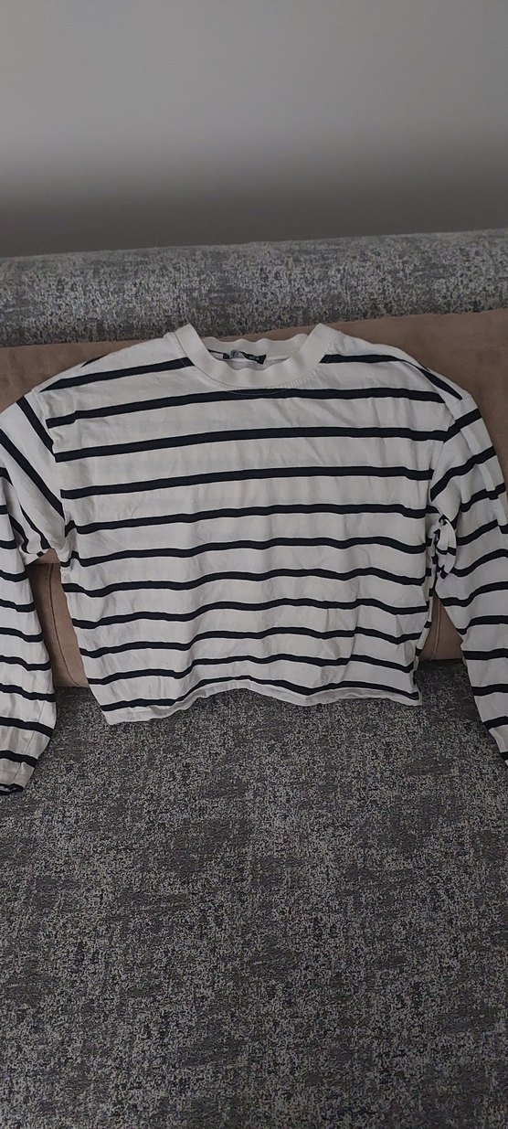 Gri ve beyaz çizgili, uzun kollu, yuvarlak yakalı, bol kesim, midi boy pamuklu triko kadın kazak. Trend sokak stili için uygundur. bikaç kez giyildi hatası yok