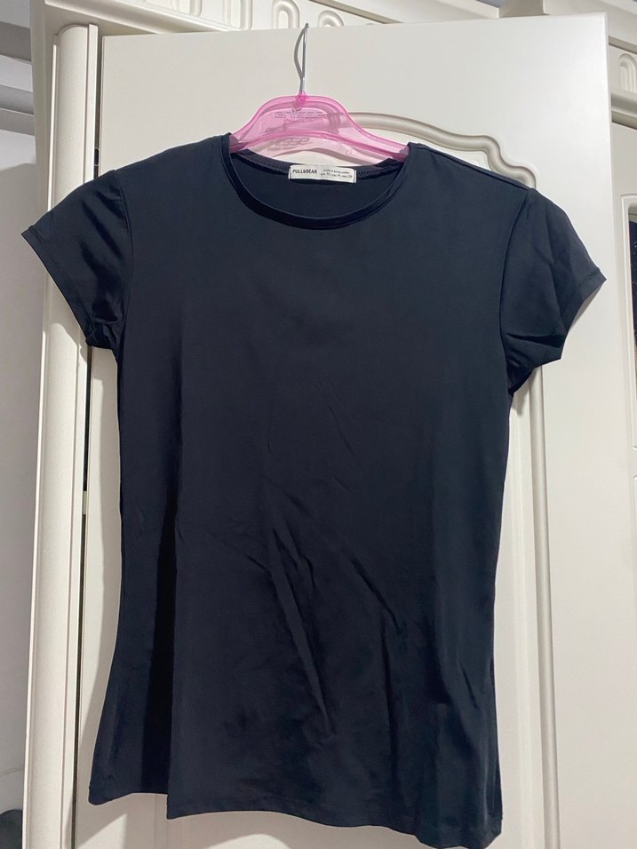 Siyah, kısa kollu ve bisiklet yaka kadın tişörtü. Düz, minimal ve rahat kesimiyle günlük kullanıma uygun, sentetik kumaştan üretilmiştir.