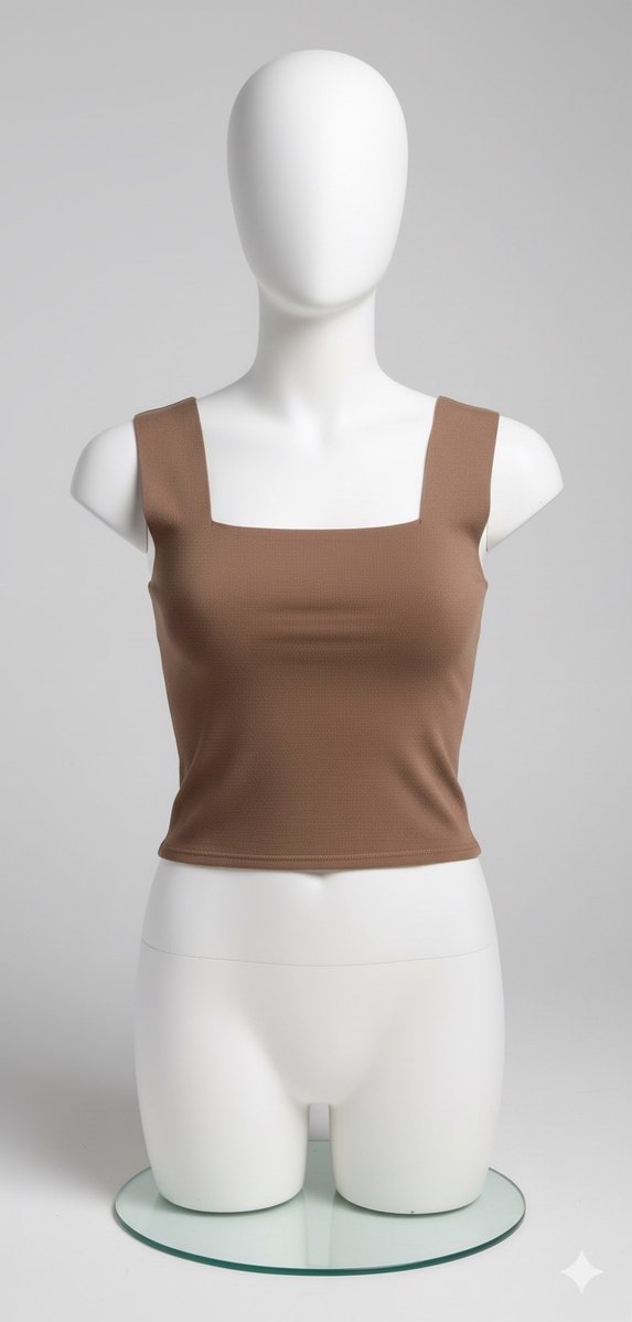 Bej renkli, sırt dekolteli, kolsuz kadın atlet. Yumuşak sentetik kumaştan, günlük sokak stili için rahat ve şık bir parça.