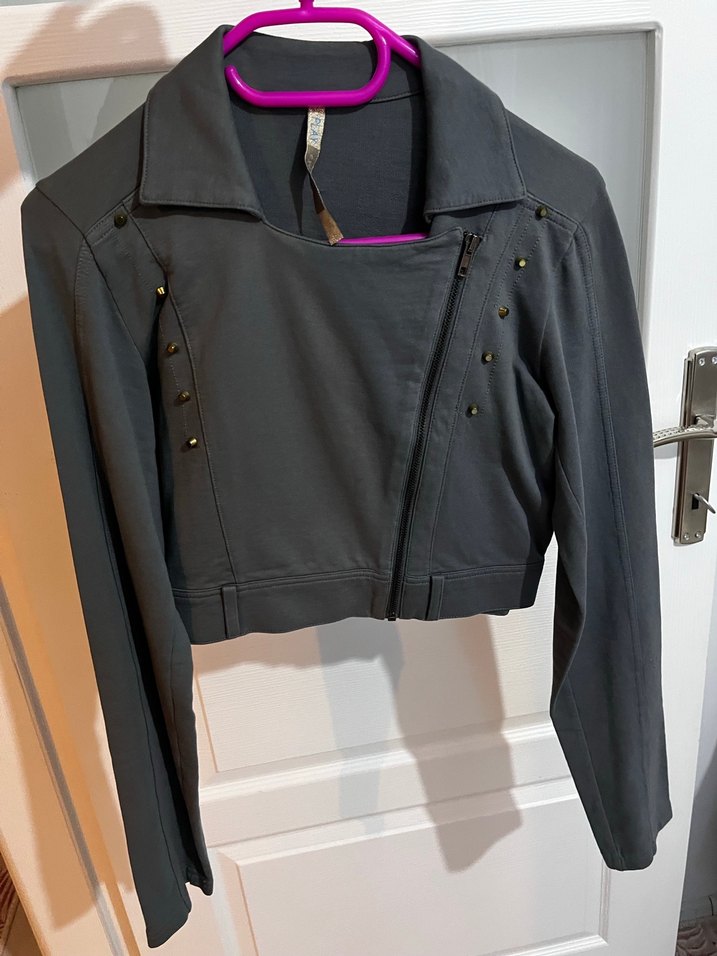 Düğmeli, ince kesim gri kadın ceketi, uzun kollu ve açık yakalıdır. midi boyda, günlük sokak stiline uygundur.