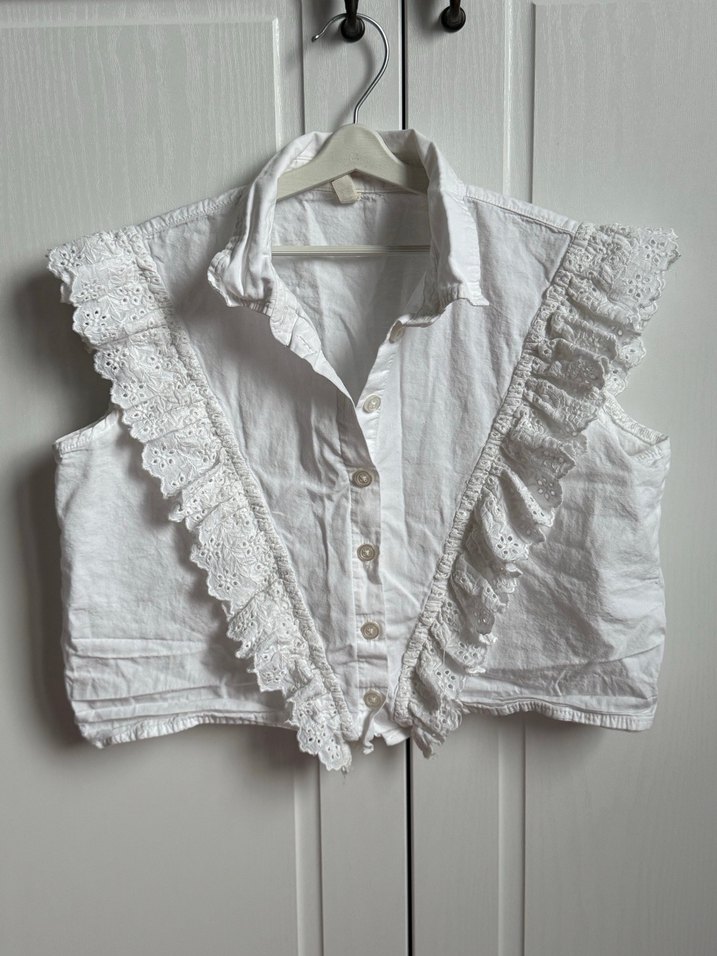 Beyaz keten, kolsuz, yakalı ve nakışlı fırfır detaylı, bol kesim vintage bohem tarzında kız çocuk gömleği. 8 yaşa uygun