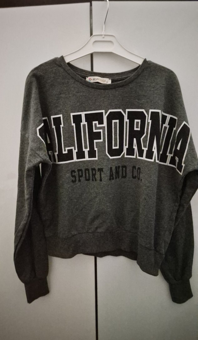 Gri renkte, uzun kollu, yuvarlak yakalı ve bol kesim kadın sweatshirt. ince kumaştan crop tarzi boy 48 cm ."CALIFORNIA SPORT AND CO" tasarımıyla spor ve sokak stili için uygundur.