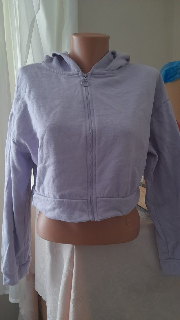 Kadınlar için mor pastel renkte, keten kumaştan yapılmış, düğmeli ve kapüşonlu bol kesim sweatshirt. Uzun kollu, bisiklet yaka ve desen içermeyen tasarım rahat kullanım sağlar.