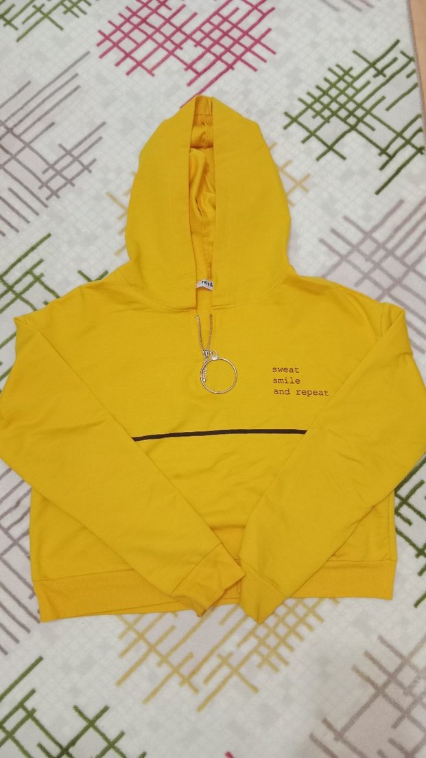 Uzun kollu, kapüşonlu sarı sweatshirt. Renkli baskı ve fermuarlı ön cep içerir. Yumuşak ve sıcak kumaştan, günlük kullanım için uygundur.