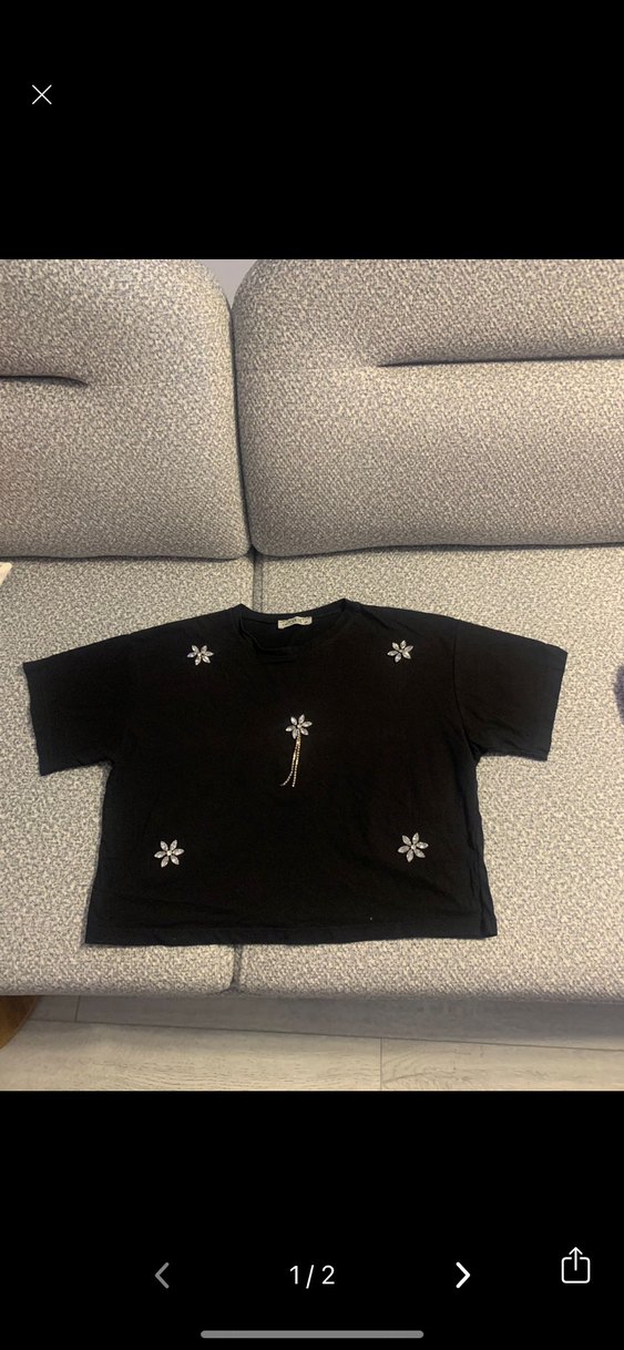 Crop siyah pamuk tişört, kısa kollu ve yuvarlak yaka. Nakışlı çiçek desenleri payetlerle süslenmiştir, bol kesim ve rahat bir tarza sahiptir.