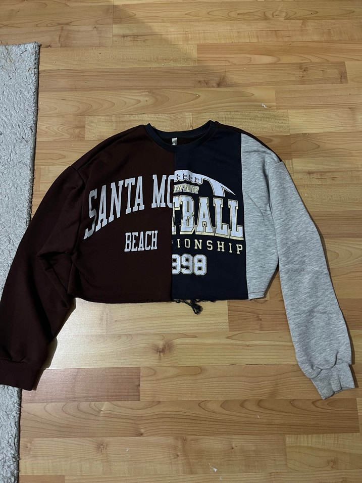 uzun kollu, bisiklet yaka ve bol kesim kahverengi baskılı crop sweatshirt