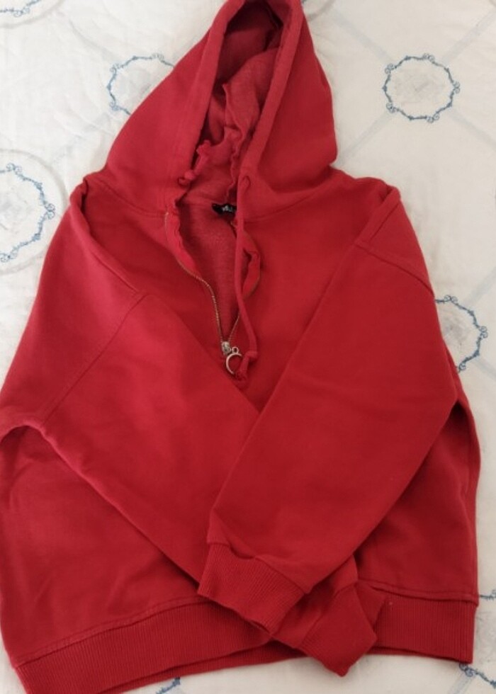 Kırmızı, kısa kışlık , yarım fermuarlı sweatshirt. Kol boyu omuzdan : 41 cm Uzunluk -kapüşon hariç-: 50 cm En : 50