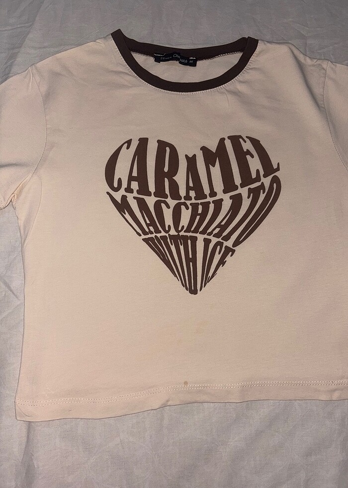 ön kısmında çok az lekesi var yıkanınca geçer mi bilmiyorum krem renk kahverengi yazılı m beden