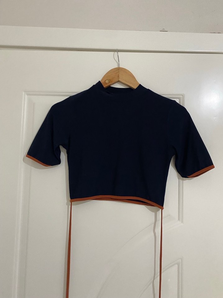 Bağlama detaylı, kısa kollu, bisiklet yaka koyu lacivert crop top. Sentetik kumaştan yapılmış, günlük kullanıma uygun şık bir parça.