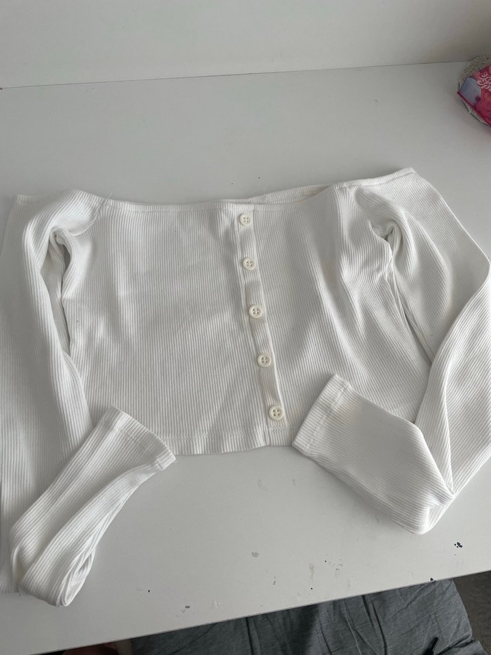 Pamuklu, düğmeli, kayık yaka, beyaz renkli, uzun kollu ve normal boyda, minimalist tarzda dar kesim triko. Günlük kullanıma uygundur.