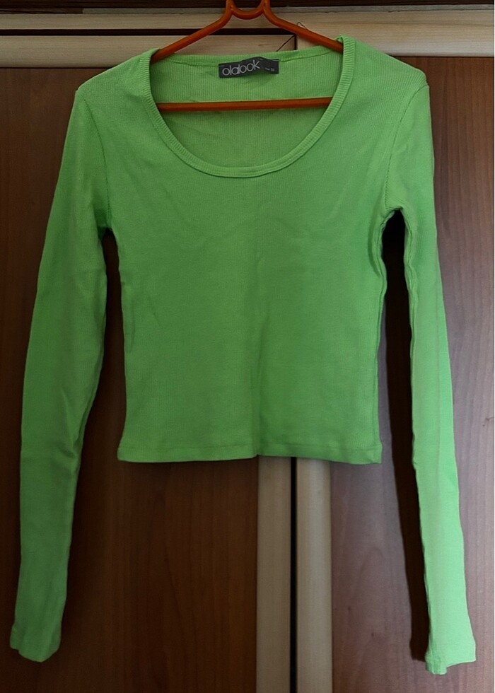 Rengi biraz daha fosforlu gibi burda fistik yesili gibi cikmis yaniltmasin. Kusuru yoktur. Crop modeldir ama asiri kisa degildir. Düz triko bluz.