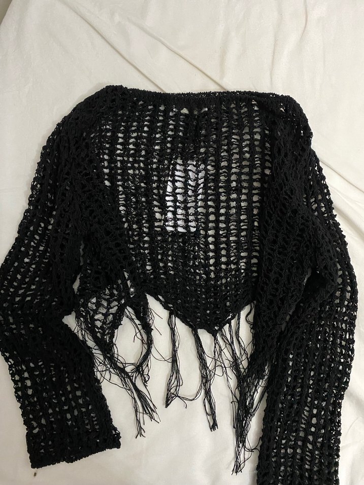 Siyah örgü kadın kazak, boğazlı ve askılı kollu. Gevşek kesim ve midi boyda, gotik ve avangart tarzda. Desensiz, günlük kullanım için uygun.