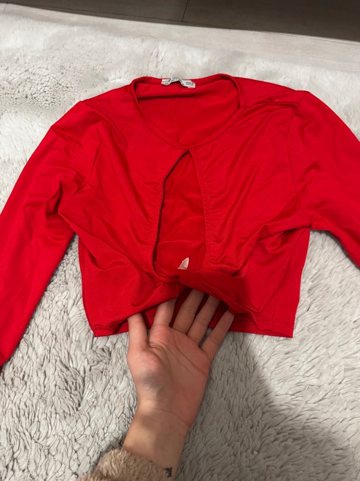 uzun kollu, düğmeli, V yaka ve parlak kırmızı renkte, yumuşak ve sıcak kumaştan yapılmış bolero.