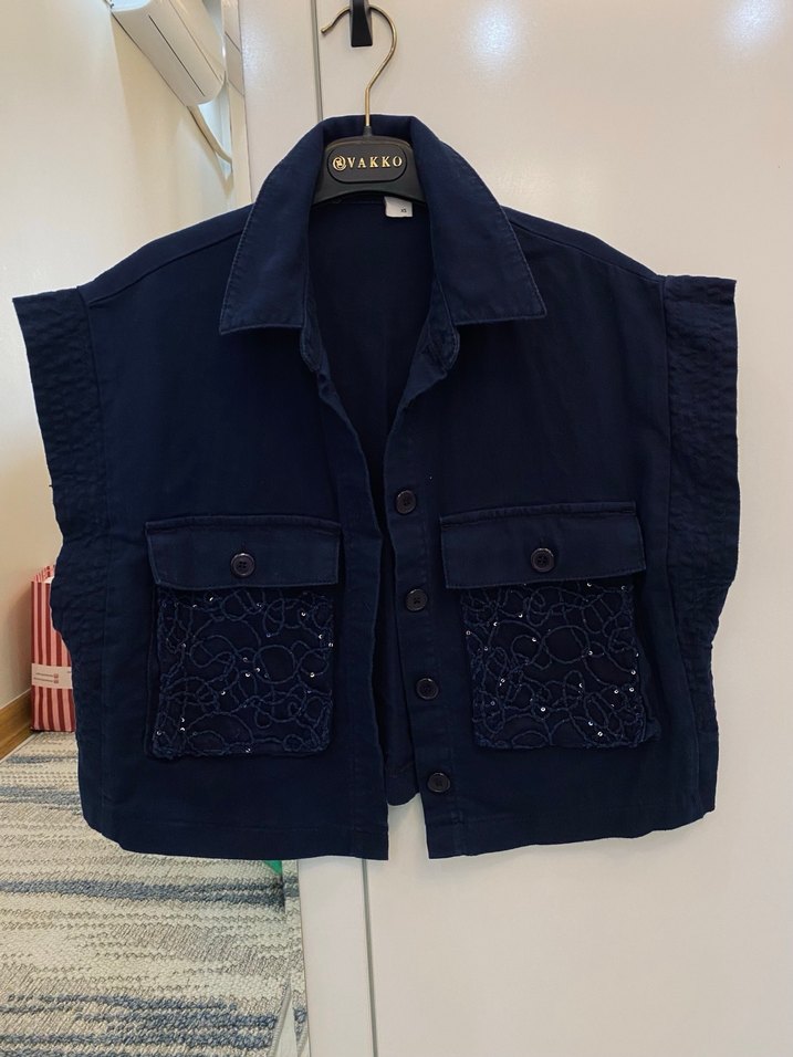 Koyu mavi kot kumaştan, düğmeli, nakışlı cepli, kısa boy, salaş kesim kadın yelek. Markası Adil Işık etiketi kesilmiş sadece oversize XS-S uyumlu