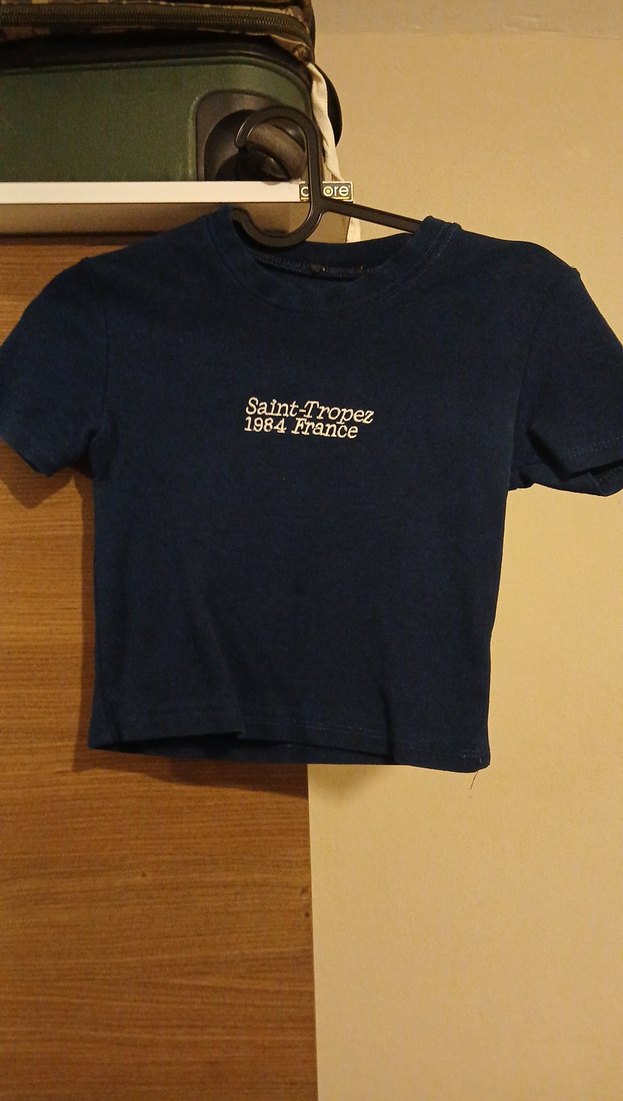 Koyu lacivert denim kumaştan, kısa kollu ve bisiklet yaka "Saint-Tropez 1984 France" baskılı, trend sokak tarzı.