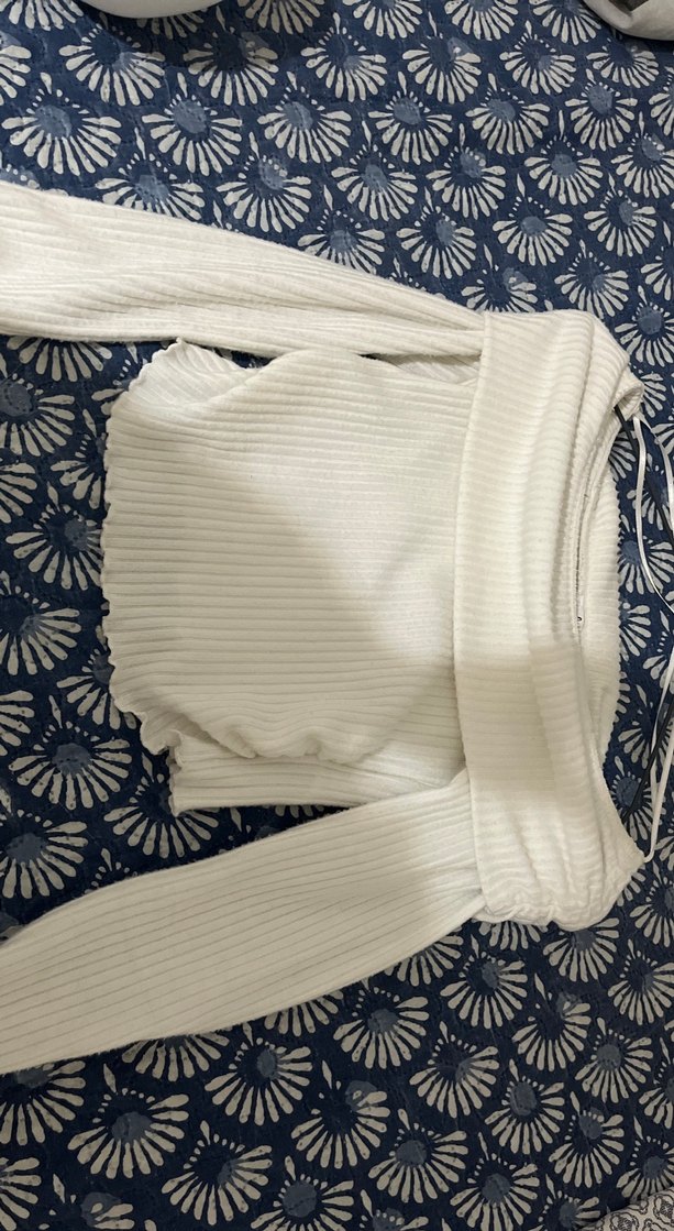 Beyaz piliseli dokulu, tekne yaka ve uzun kollu, günlük kullanıma uygun normal boyda dar kesim triko. Sadece 1 kere giydim doğru iç çamaşır ile iç göstermez