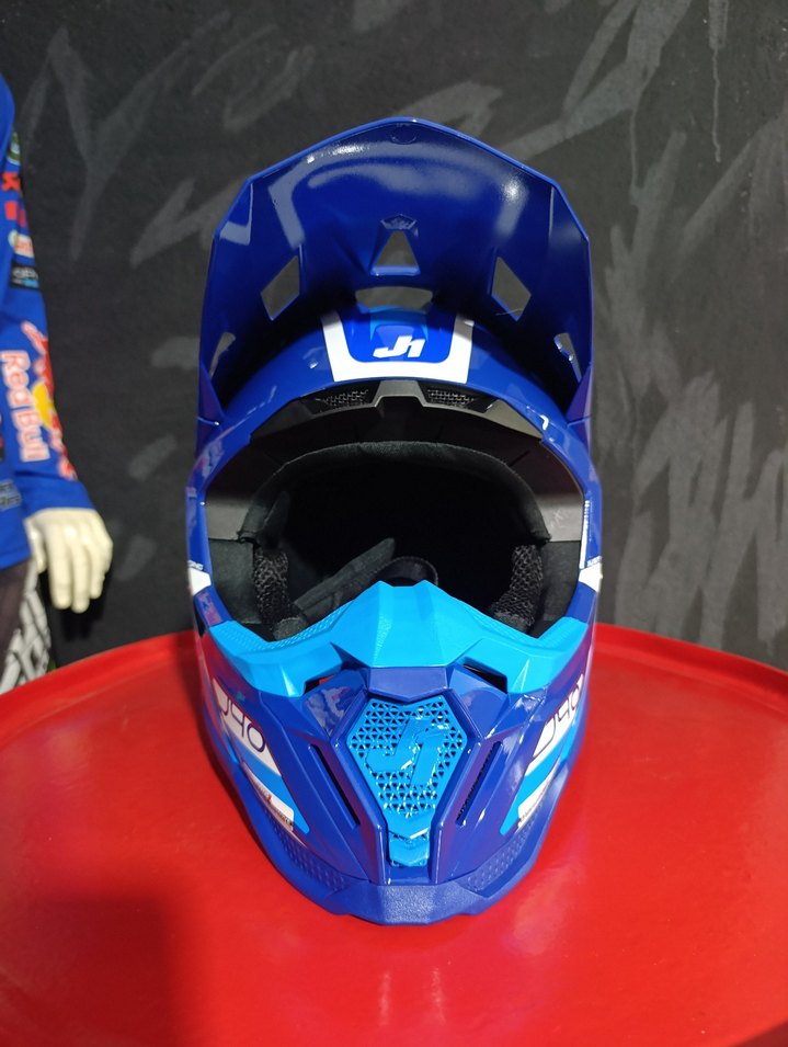 Renkli mavi biker motokros kaskı, plastik dış yüzey ve baskılı desen içerir. Velcro kayışla güvenli tutuş sağlar, minimalist ve temel koruma sunar. ️ l xl beden mevcuttur