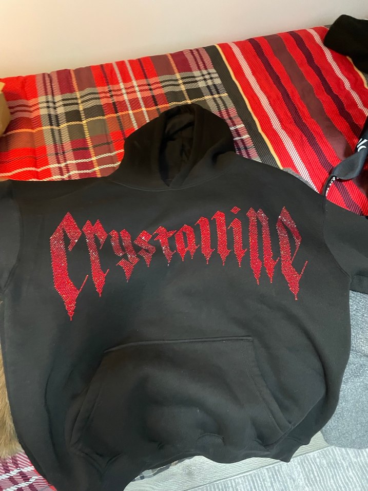 Taşlı sweatshirt. Siyah kapüşonlu, uzun kollu ve bol kesim unisex sweatshirt. Önünde kırmızı payetli gotik baskı bulunur. Sentetik kumaştan, günlük kullanıma uygun.