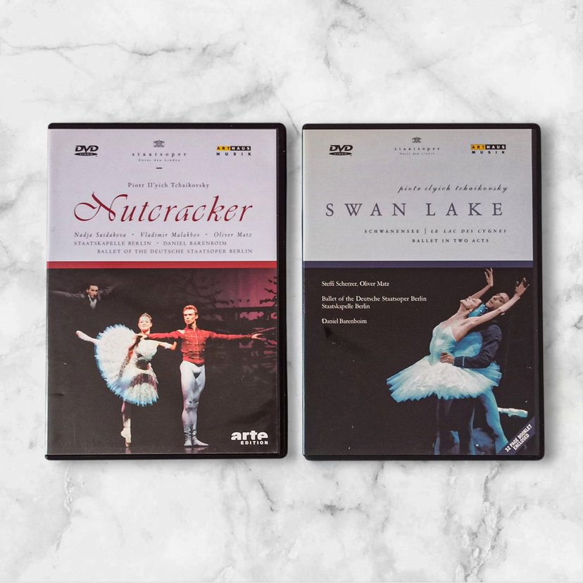 Deutsche Staatsoper Berlin - Berlin Devlet Operası'nda sahnelenen Tchaikovsky'nin bale topluluğunun 'Swan Lake' Kuğu Gölü ve 'Nutcracker' Fındıkkıran balelerini içeren iki adet bale DVD'si. Almanya'dan almıştım. ürünler Dvd'nin yanı sıra kitapçıklar da içerir, kitapçıklarda balenin konusu, besteci, dansçılar ve eser hakkında bilgiler vardır. Temiz ve çalışır.