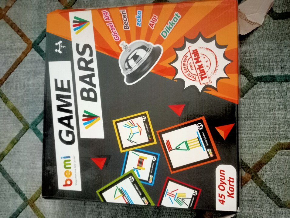 Çubuklarla görsel algı, zeka ve dikkat geliştiren çok renkli kartlarla oynanan bir masa oyunu. Türkiye'de üretilmiştir. Sadece oyunun zili bozuk,bu da oynamaya engel olmuyor,normalde oynarken şekli bitirince zile basılması gerekiyor,zil bozuk olduğu için biz bitti diyerek yada ellerimizi birbirine vurarak bitirdigimizi söylüyoruz.Onum dışında hiçbir parçası eksik yada hasarlı değildir.