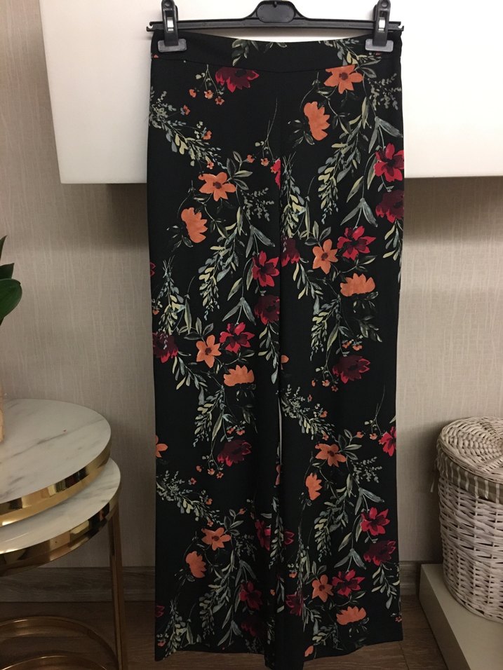 S beden kumaşı polyester esnek değildir, tiril tiril bir pantolon yandan fermuarlı, yalnızca 1 kere giymiştim çok hoş duruyor giyince. Boy 105, bel 36 cm’dir